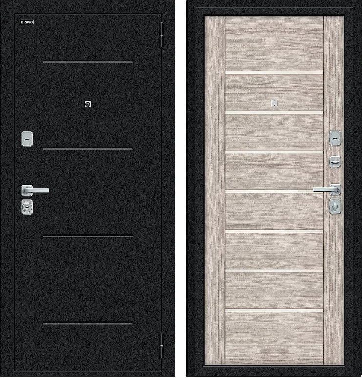 Надежная входная Дверь Браво Техно/BChrome Букле черное/Cappuccino Melinga премиум класса по цене 34 735 руб. Большая толщина стали защитит от проникновения в ваш дом, квартиру или коттедж. Используется очень качественная фурнитура: замки, цилиндры, ручки, защелки. Покрытие и отделка двери изготовлено под внимательным контролем производителя. Дверь имеет долгий срок службы и гарантию.